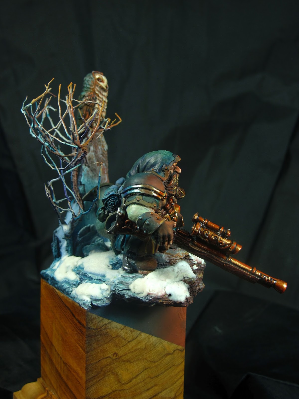 Die Idee mit dem Sockel gefällt mir ausgesprochen gut und der Zwerg auch. Bist du über manche Teile, z.B. das Zielfernrohr, mit Klarlack am Schluss drüber?