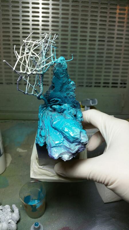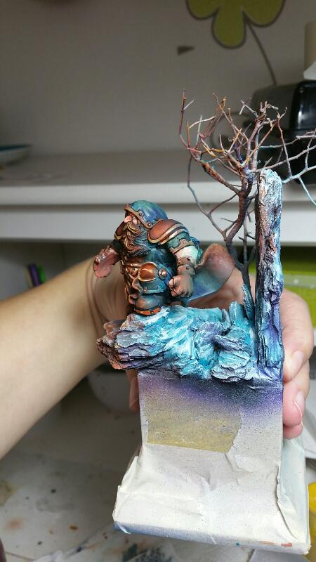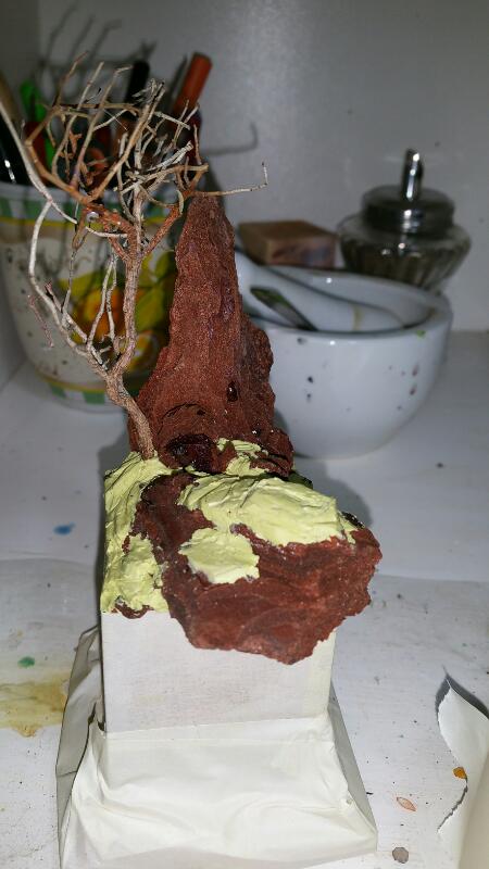 Der felsige Teil besteht aus grobem Rindenmulch, der Baum ist einfach nur ein Ast und ich habe das Ganze etwas mit Miliputt verbunden und so angepasst, dass der Zwerg ordentlich stehen kann:
