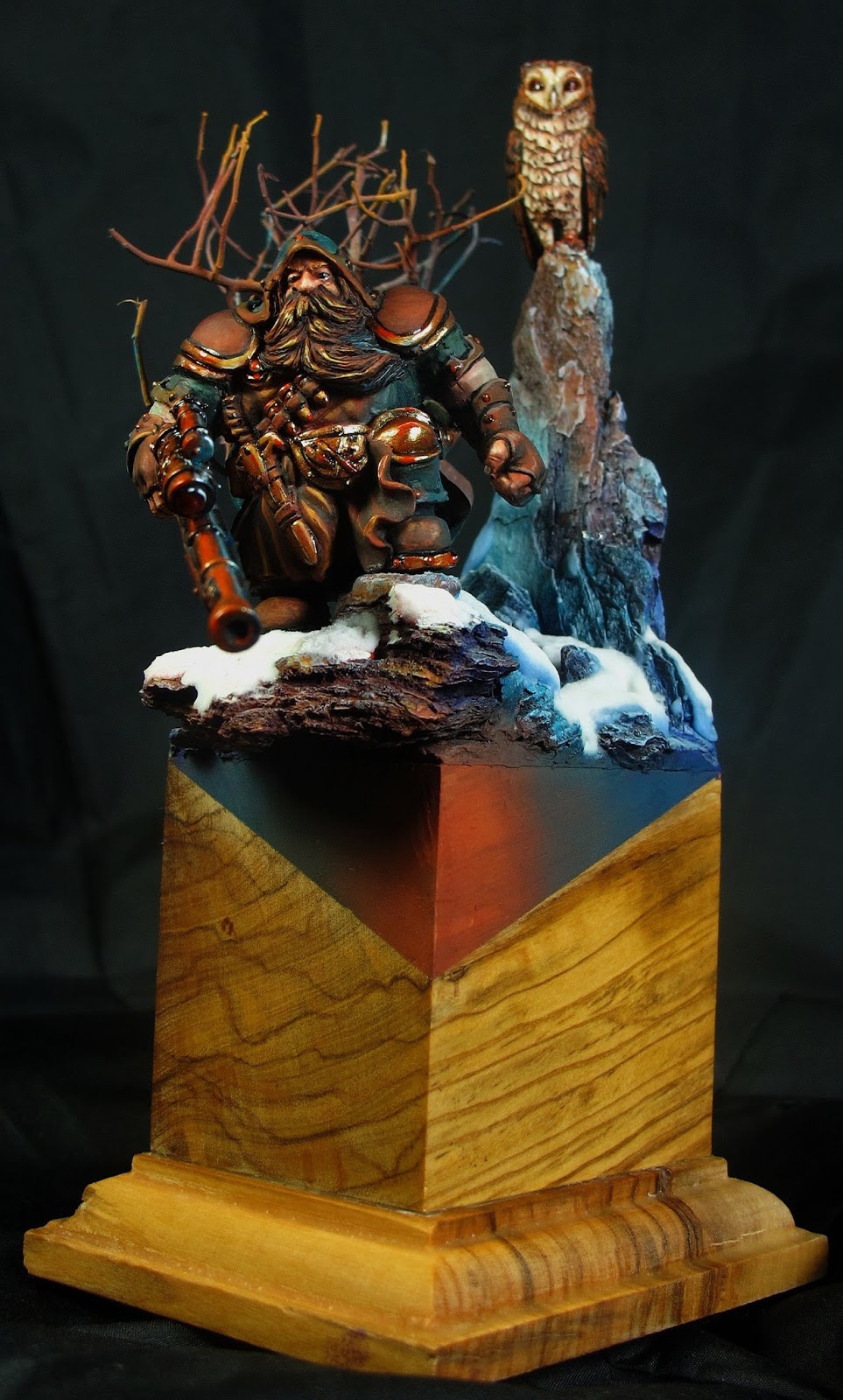 Lang lang ists her - Der Zwerg hatte also einige Zeit mich anklagend aus der WIP -Ecke heraus anzustarren. Nun ist der Funke wieder übergesprungen und er hat auch gleich ein Tier mit auf die Base bekommen, weil er mich einfach so an die WOW Zwerg (Klasse Jäger) erinnert. Ich hatte so meine Probleme mit ihm - was vor allem der Lichtsituation geschuldet war. Ich fand das irgendwie echt schwierig - und an einigen Stellen stimmt das Licht auch nicht so wirklich. Der bunte Keil auf dem Sockel war ein Experiment, um das Ganze irgendwie höher wirken zu lassen und noch eine Verbindung zum Sockel zu bekommen. Das war eben einfach irgendwie alles oben drauf, aber irgendwas hat mir noch gefehlt. Mir gefällt das eigentlich ganz gut so.
