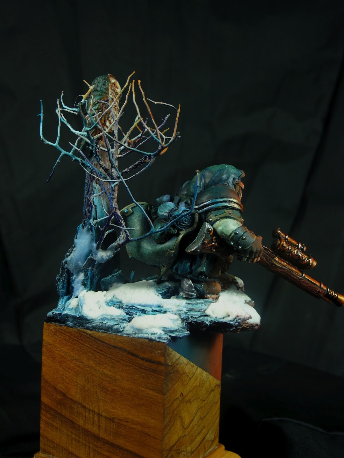 Die Idee mit dem Sockel gefällt mir ausgesprochen gut und der Zwerg auch. Bist du über manche Teile, z.B. das Zielfernrohr, mit Klarlack am Schluss drüber?