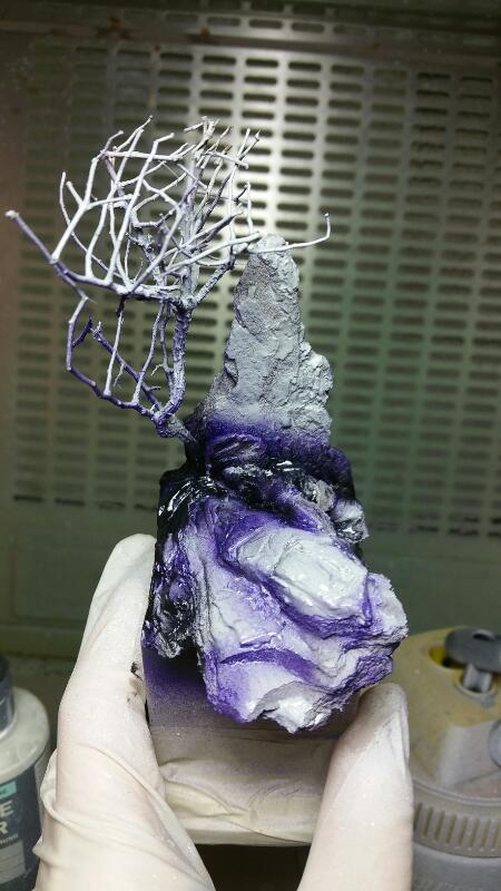 Der felsige Teil besteht aus grobem Rindenmulch, der Baum ist einfach nur ein Ast und ich habe das Ganze etwas mit Miliputt verbunden und so angepasst, dass der Zwerg ordentlich stehen kann: